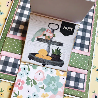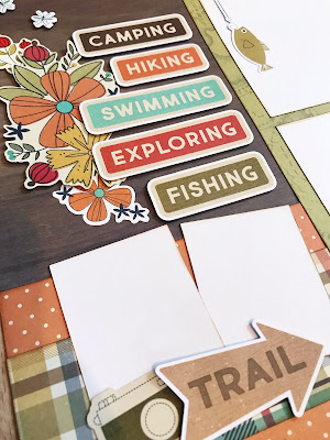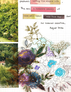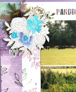Once I had my fold back adhered down, I added my photos (each backed with a couple pattern papers from the collection first) over the middle of the fold. Then I embellished with the Floral Ephemera so it looked like florals were spilling from the fold behind the photos.