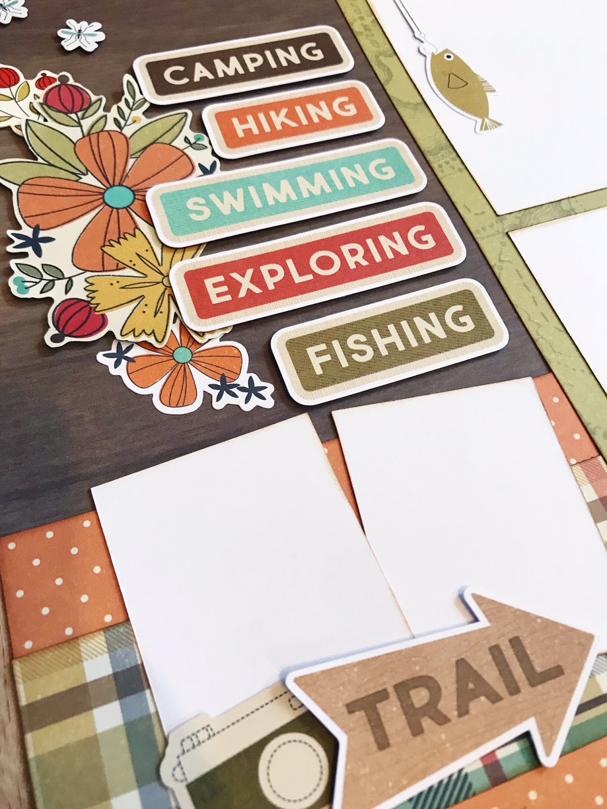 I love to cascade three photos overlapping just slightly either down the right or left of the page OR across the ‘just above’ the middle space on the page horizontally. I back each photo with a couple of coordinating papers and then focus most of the embellishments around the photos too.