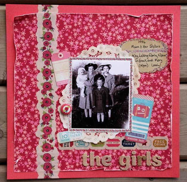 The gorgeous floral design on this patterned paper was perfect for a heritage photo of my mom and her sisters from 1946. The stunning washi tape made an interesting border and a platform for my photo to rest on. I made the layout a bit more feminine by adding a doily and finished it up with the Thickers title and bits and pieces from the kit, including flair, some die cuts and smooth as silk rub on rollers on the photo and journal spot borders.