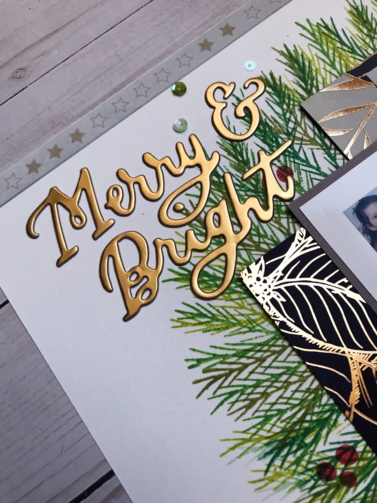 I added a wooden tree from the wood flourishes pack in the kit, coloured with a red ink pad, and the gold holly leaves and berries from the Christmas Thickers pack.